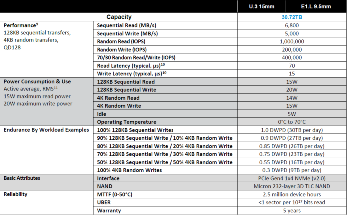 2.5英寸的外尺寸意味着我们审查的1U和2U服务器每U有12个前置热插拔驱动器或368.64TB/U,而不需要特殊的存储机箱。相比之下,可以在1U服务器的正面安装4个3.5英寸驱动器,也可以在2U服务器的前面安装12个3.5英寸的驱动器。即使现在很容易买到30TB的硬盘,它们最多只能提供固态硬盘密度的三分之一到一半。当然,固态硬盘的速度、成本和功耗都更高,但这种密度游戏正是美光所关注的。